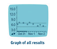 The OneTouch® UltraSmart® displays logbook information on-screen, including charts and graphs for key indicators like pre- and post-meal glucose levels & hypoglycaemic information.